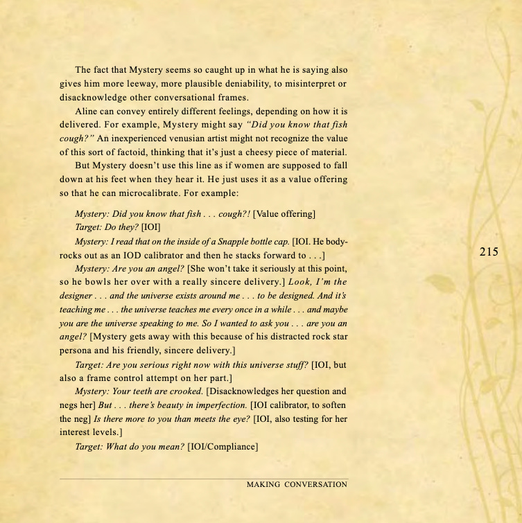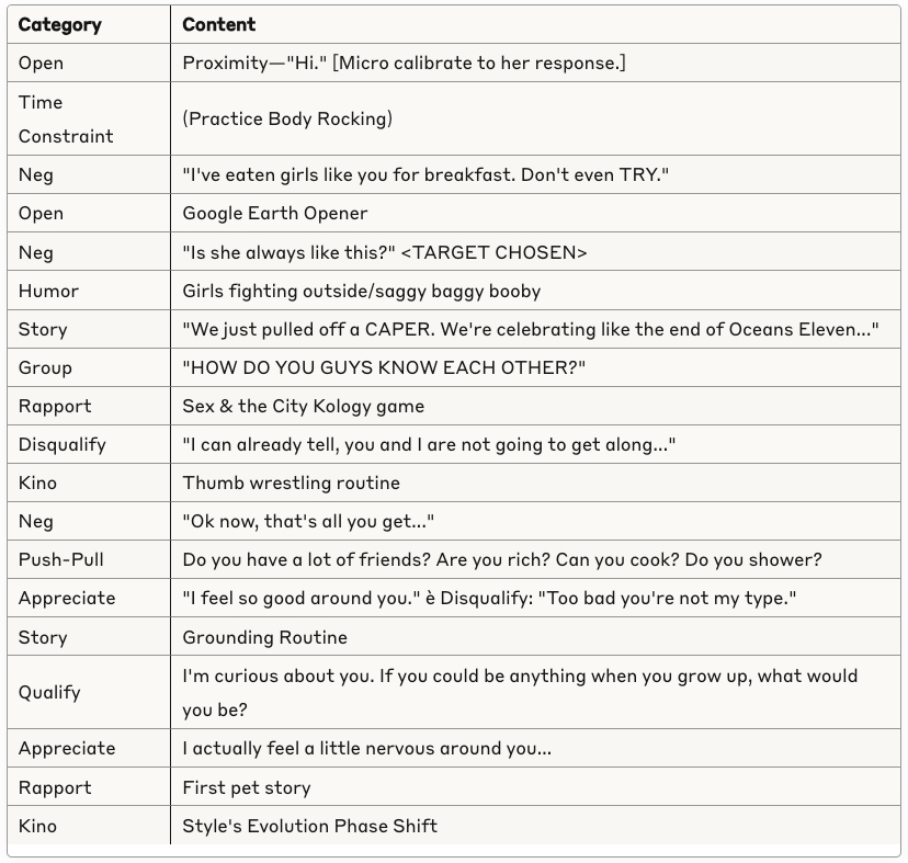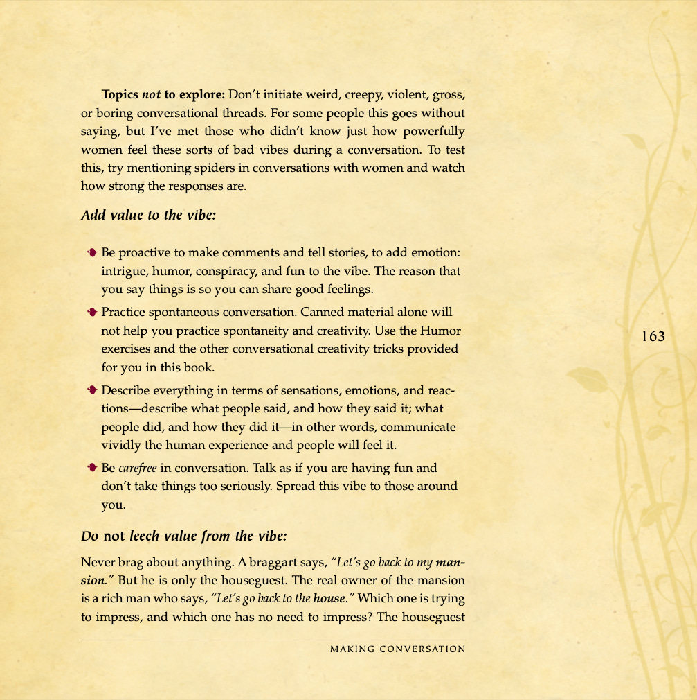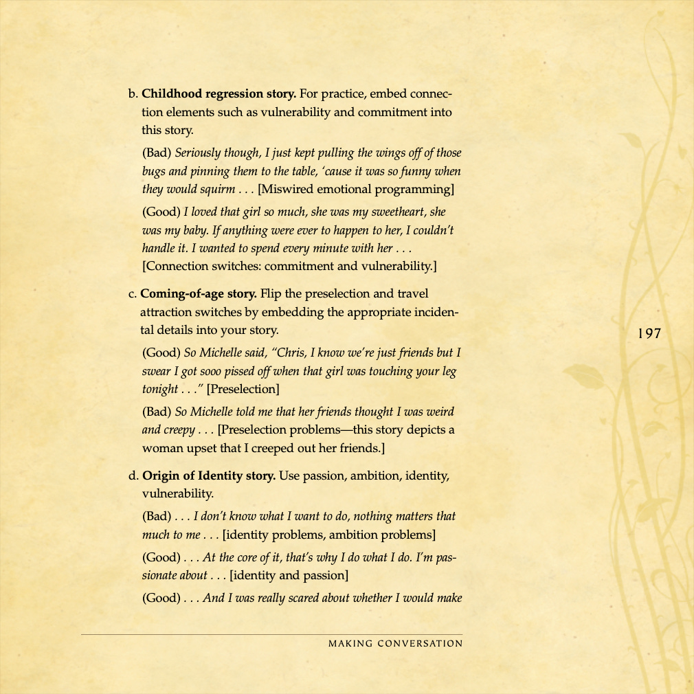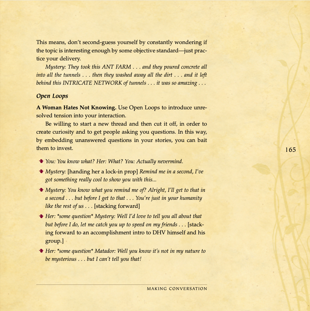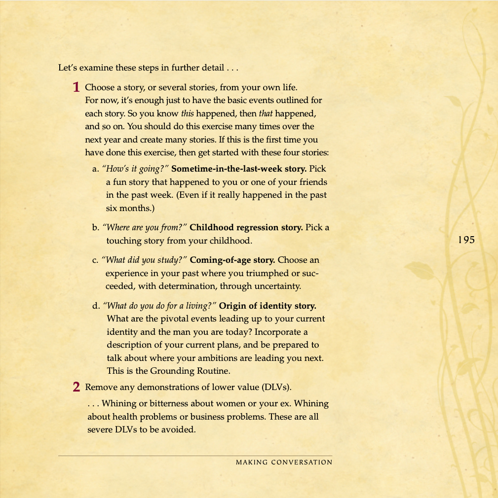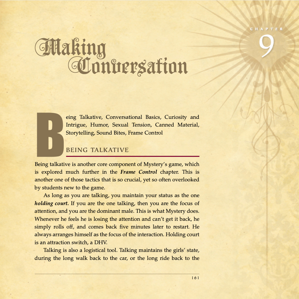 Conversational basics, curiosity and intrigue, humor, sexual tension, storytelling, sound bites, and frame control.
