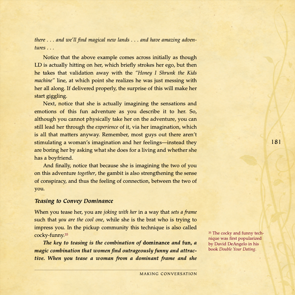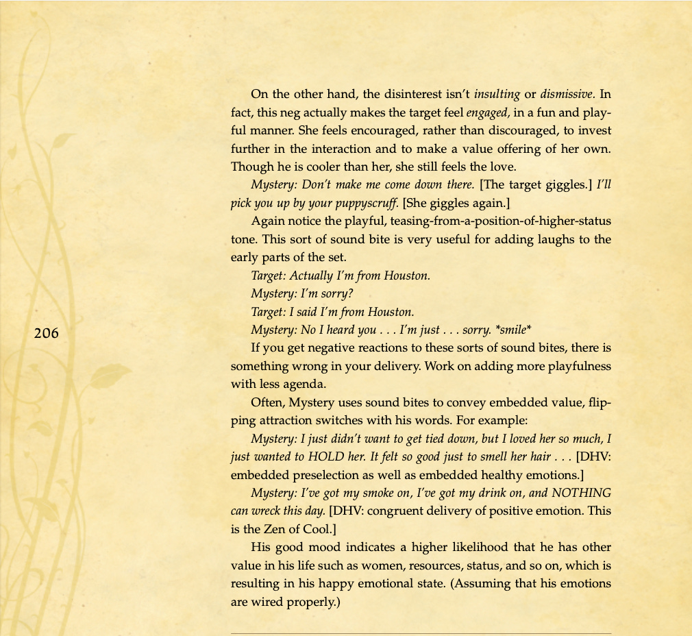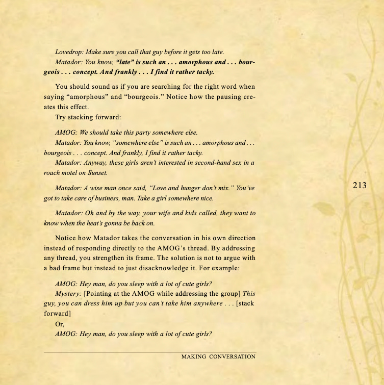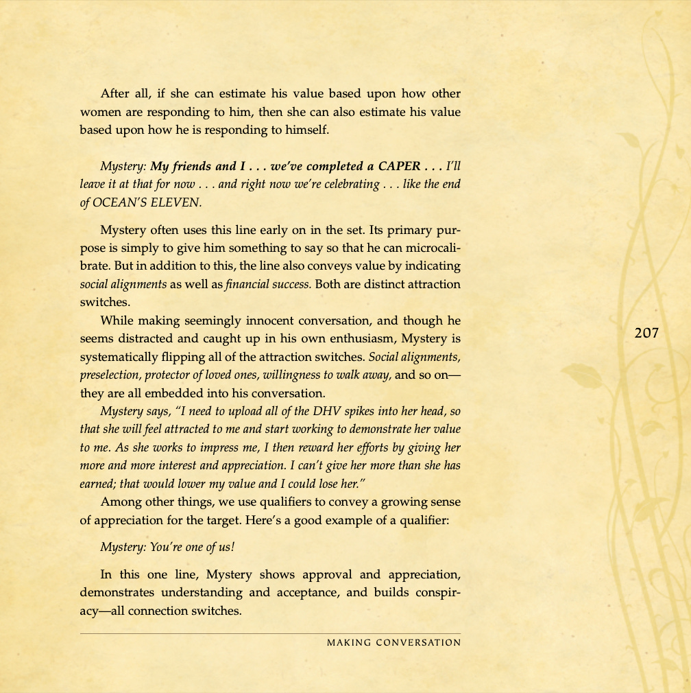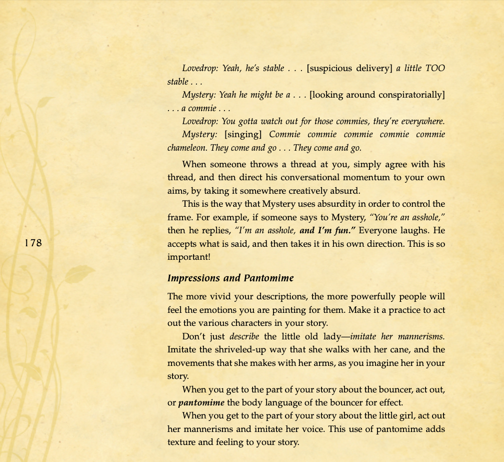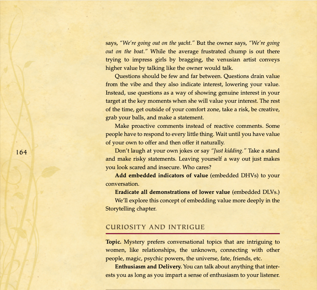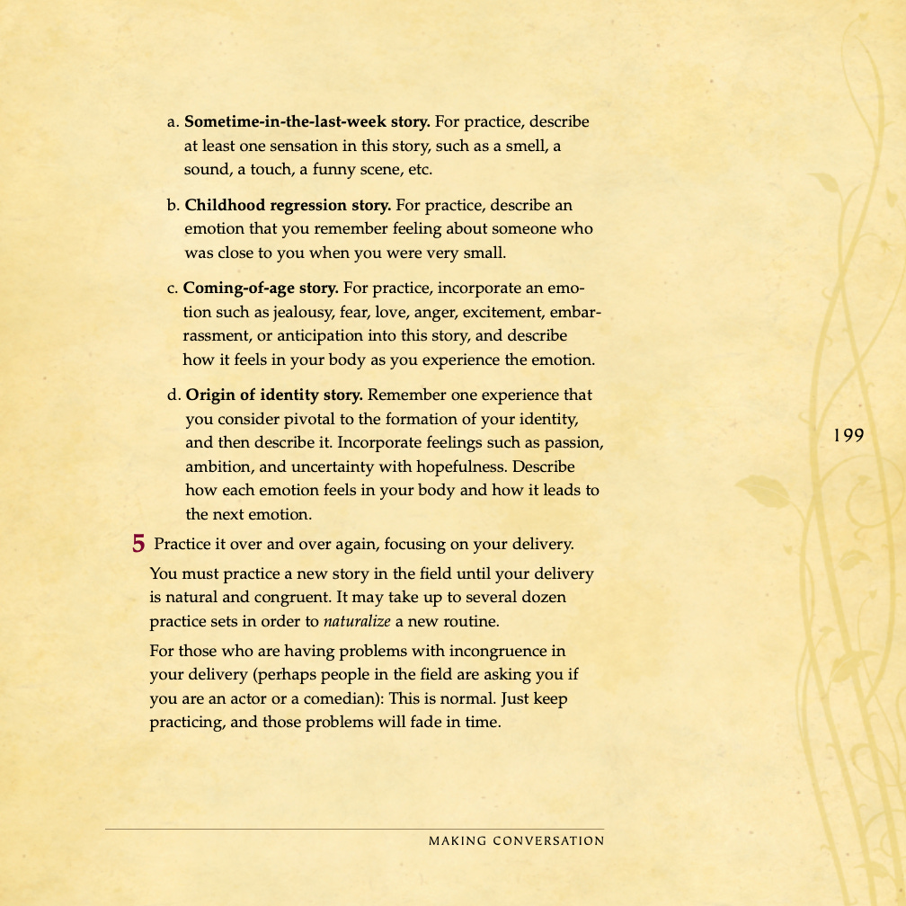 Conversational basics, curiosity and intrigue, humor, sexual tension, storytelling, sound bites, and frame control.