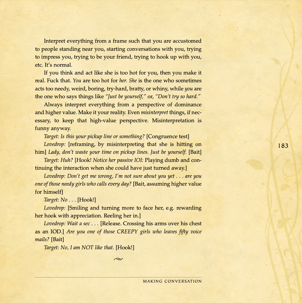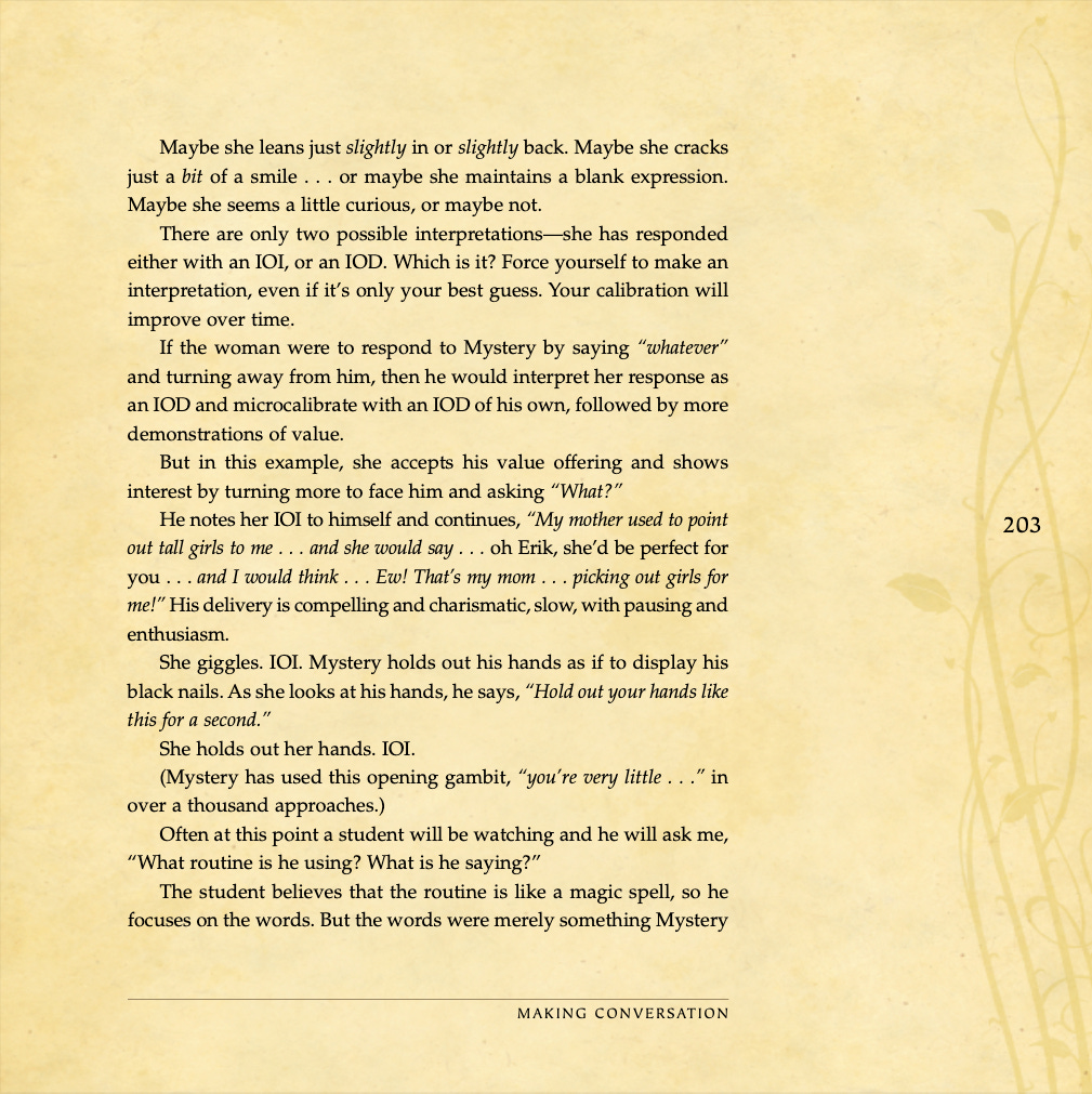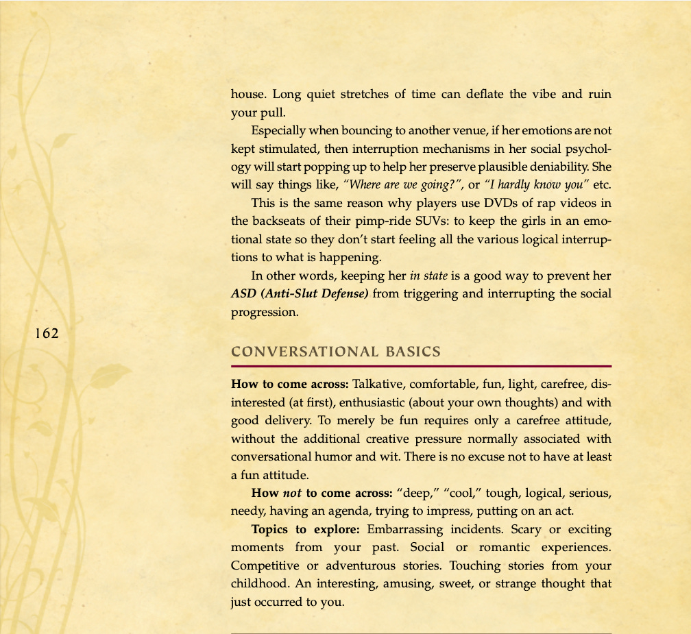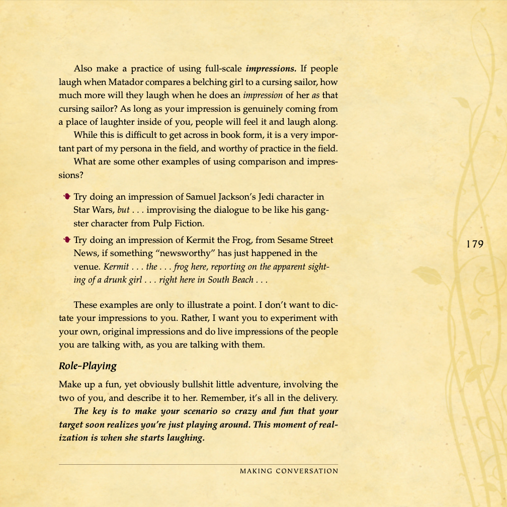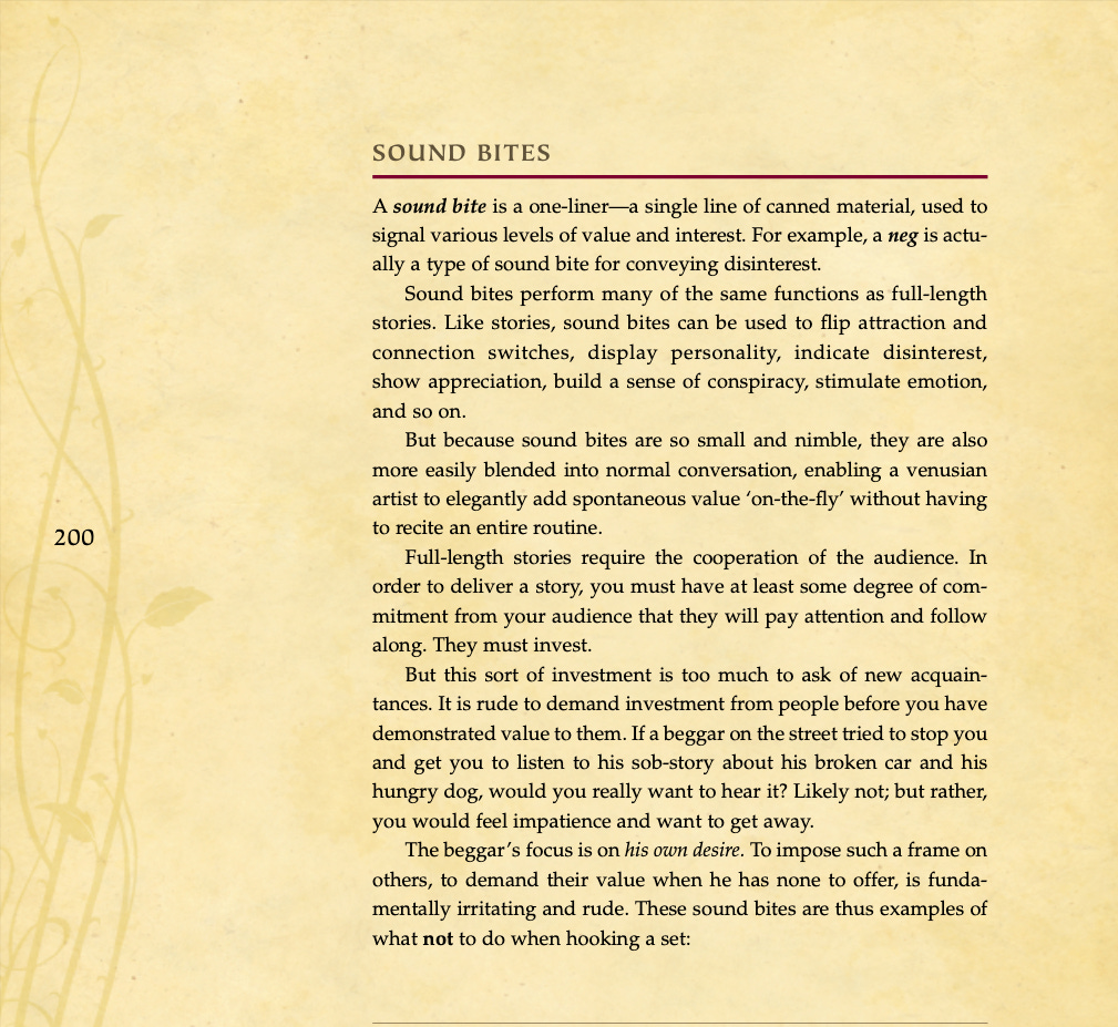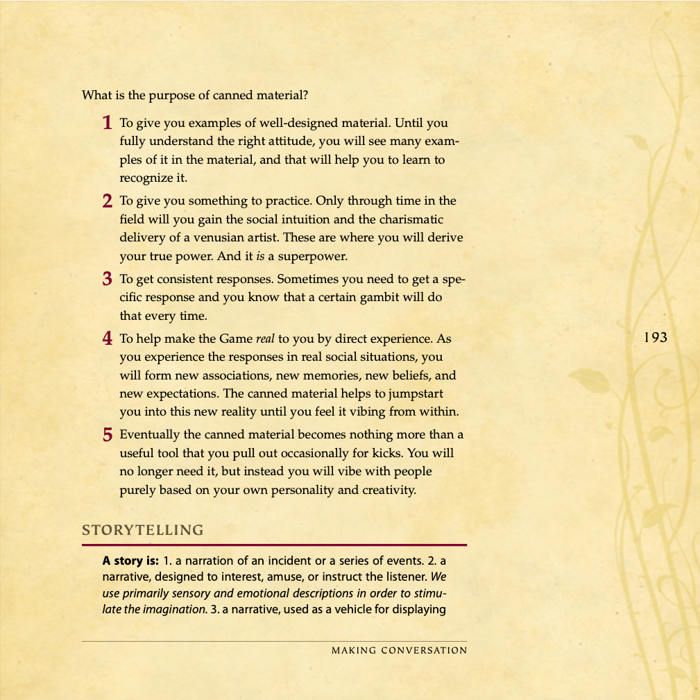 Conversational basics, curiosity and intrigue, humor, sexual tension, storytelling, sound bites, and frame control.