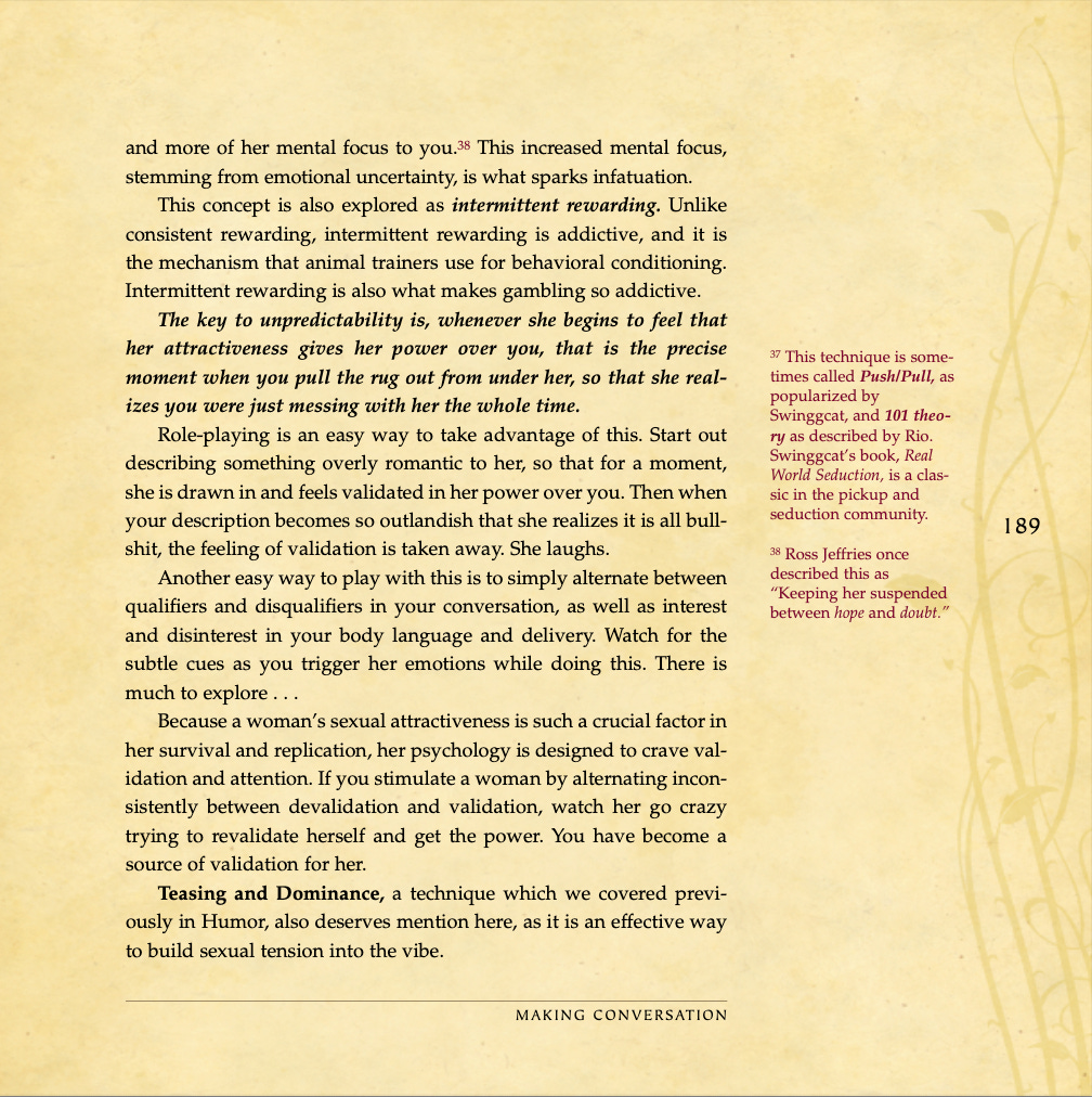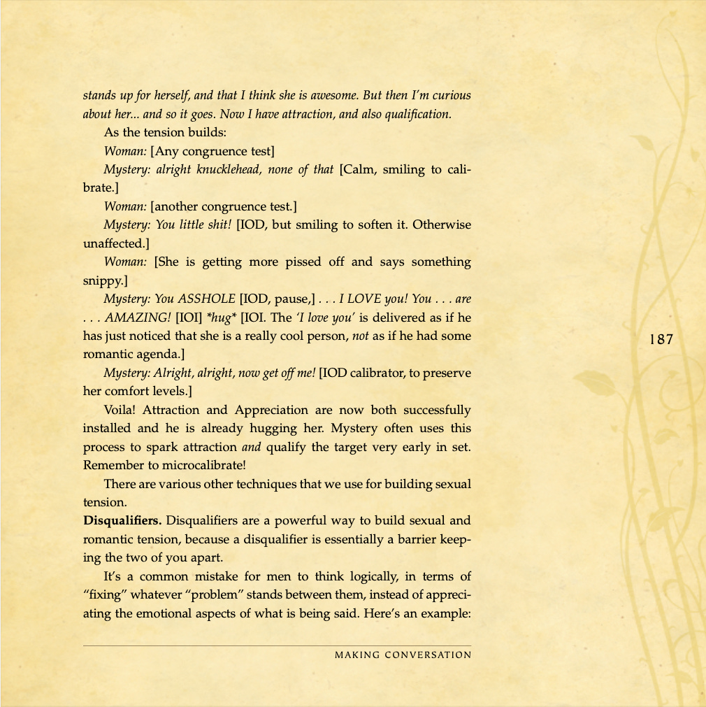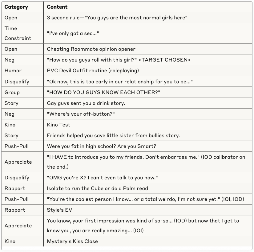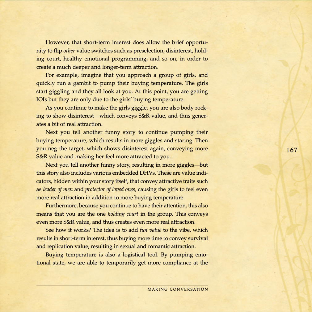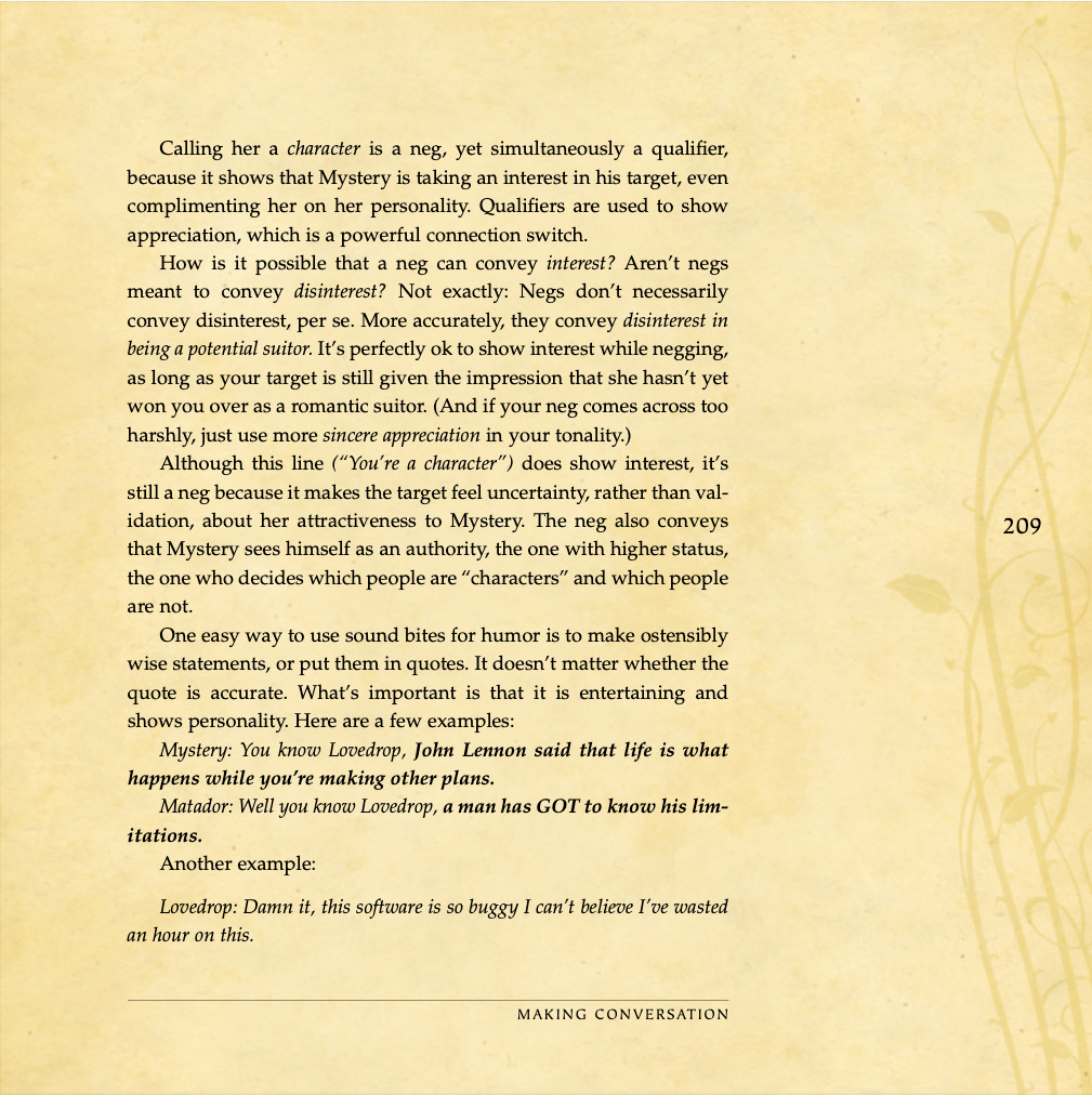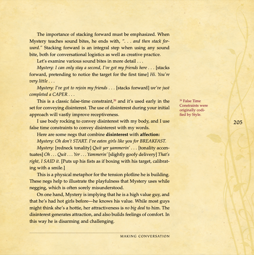Conversational basics, curiosity and intrigue, humor, sexual tension, storytelling, sound bites, and frame control.