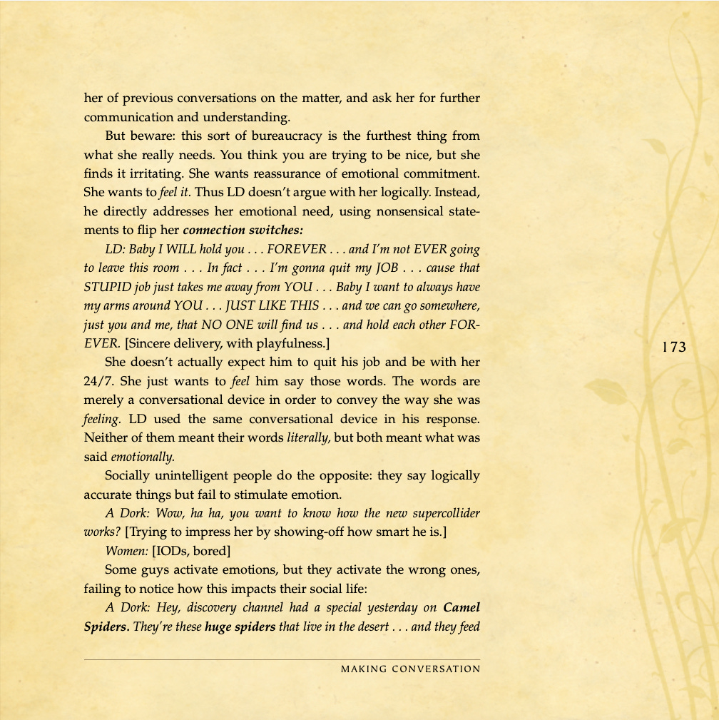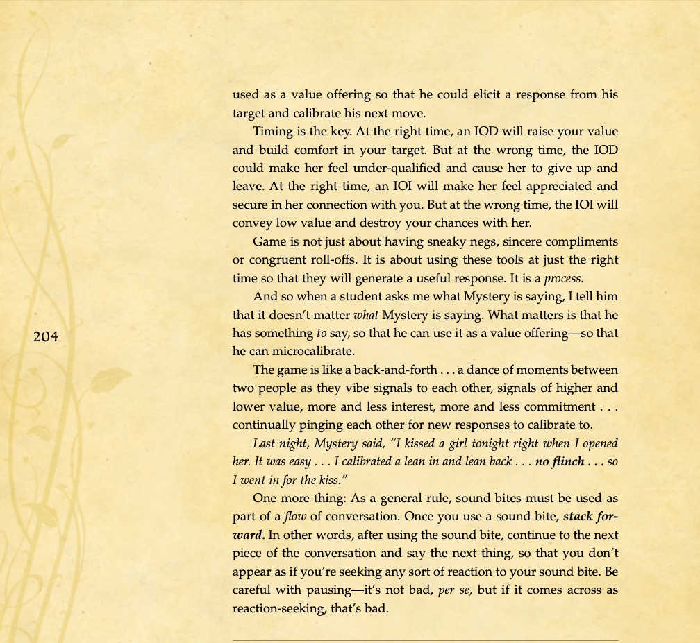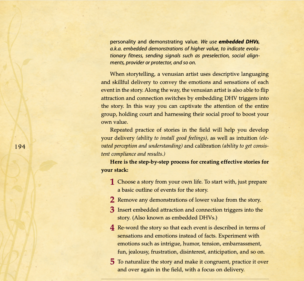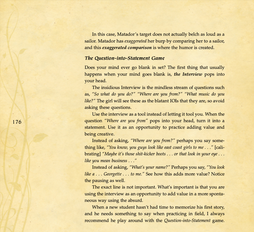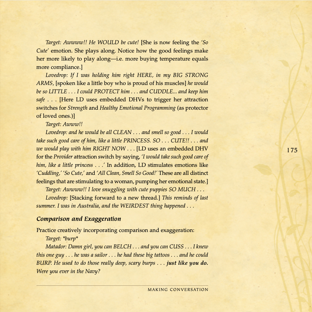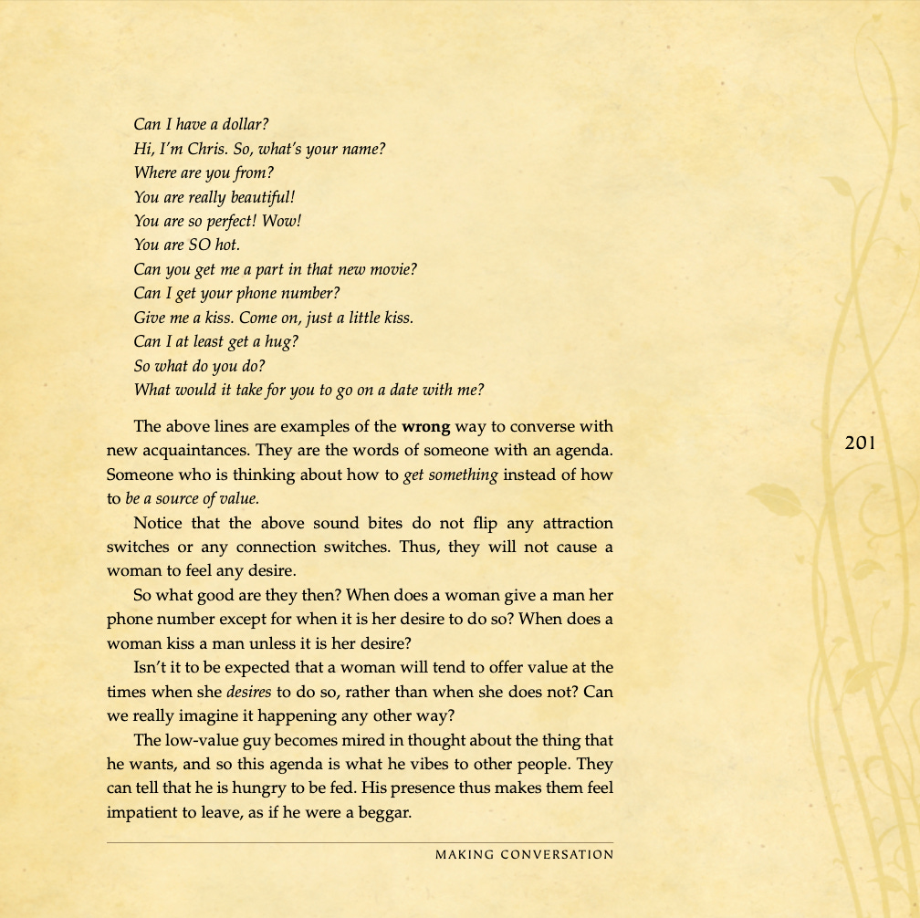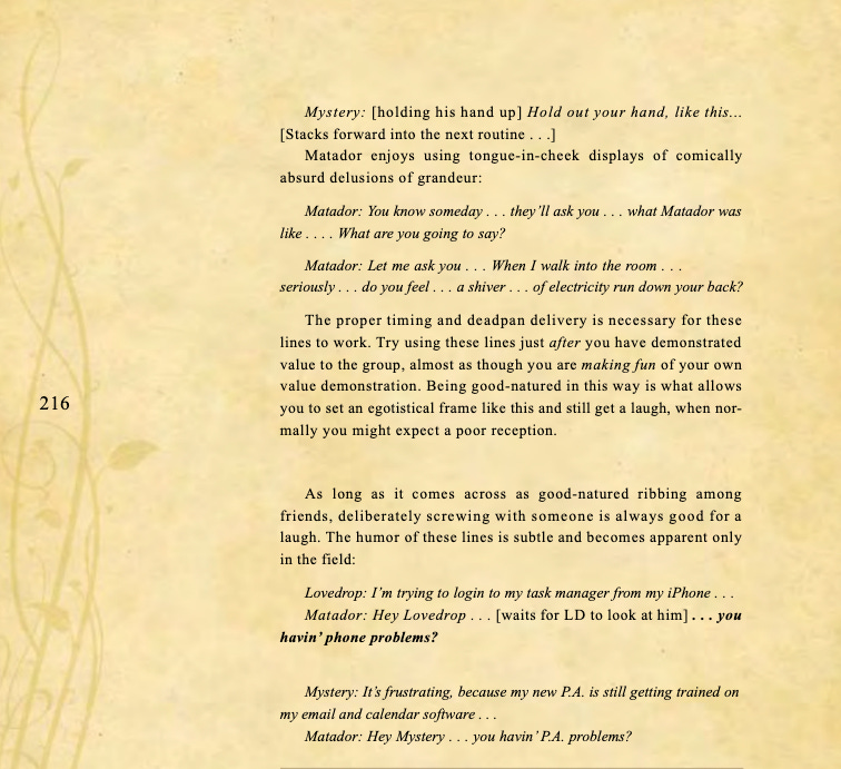 Conversational basics, curiosity and intrigue, humor, sexual tension, storytelling, sound bites, and frame control.