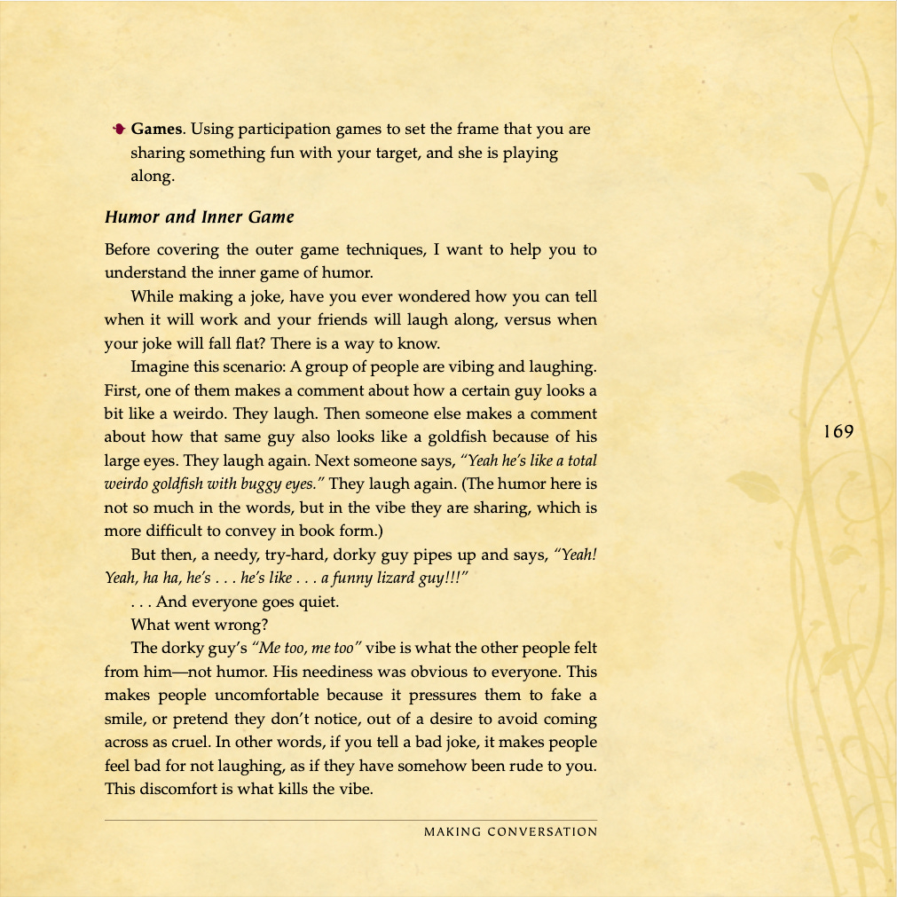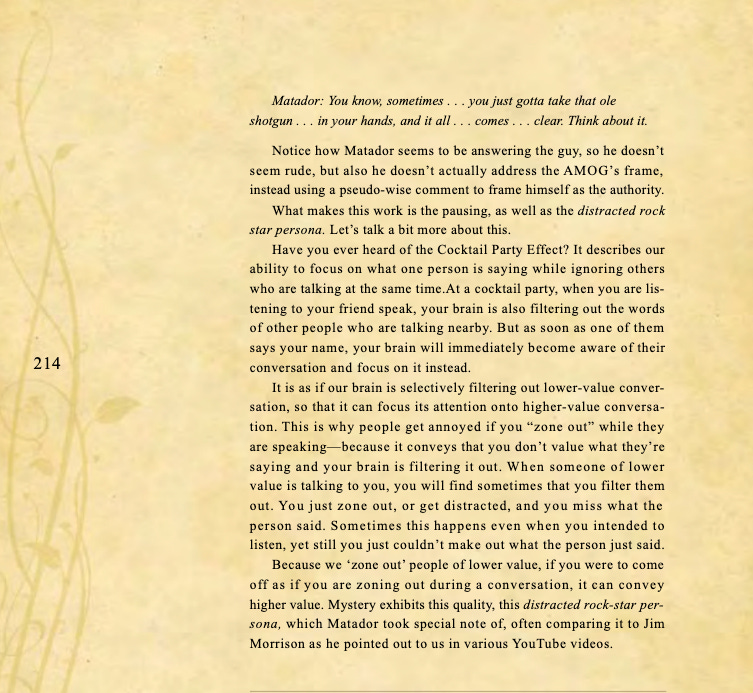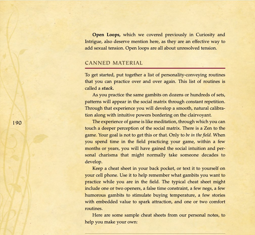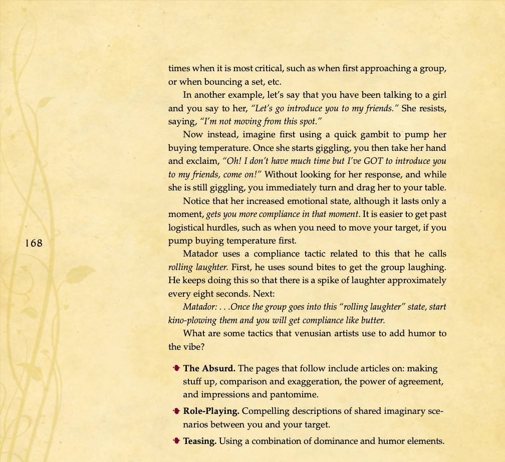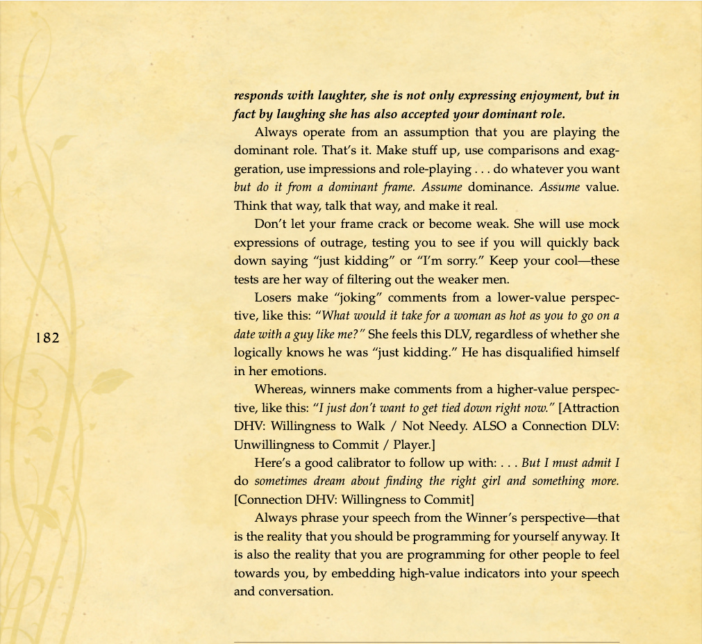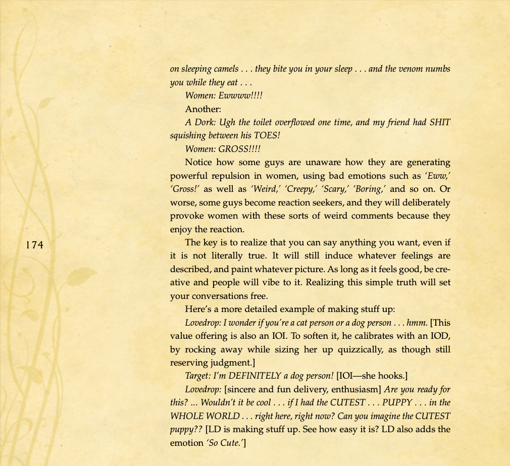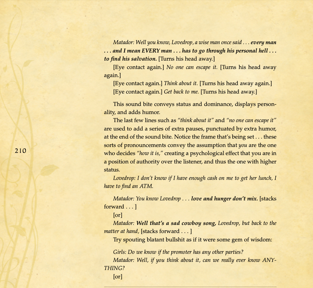 Conversational basics, curiosity and intrigue, humor, sexual tension, storytelling, sound bites, and frame control.